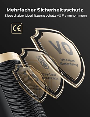 Meervoudige veiligheid: gemaakt van V0-vlamvertragende materialen met meerdere veiligheidsfuncties, waaronder geïntegreerde intelligente kantelbeveiliging, oververhittingsbeveiliging, 12-uurs timer, 24-uurs automatische uitschakeling zonder interactie, V0-vlamvertragende 2-polige eurostekker, en robuust, 1,80 m lang, plat netsnoer. Veilig en zorgeloos gebruik voor de hele dag