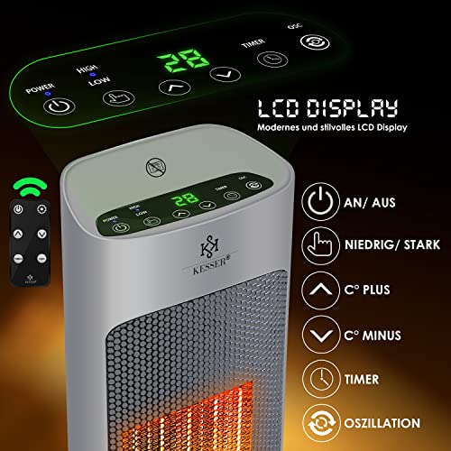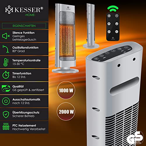 KESSER Ventilatorkachel met afstandsbediening, energiebesparend, stil, 2000 W, keramische warmtestraler, staande warmtestraler, 15 – 30 °C, snelverwarming met 80 graden oscillatiefunctie, 24-uurs timer, torenverwarming, grijs