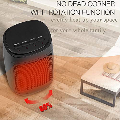 Instelbare thermostaat: deze verwarmingsventilatorstroom gecombineerd met 2 instelbare thermostaten (hoge hitte 1200 watt, normale warmte 750 watt) kan de klant de nodige thermostaat instellen om een aangename kamertemperatuur te bereiken. Druk gewoon op de rotatieknop. Deze kleine kachel draait automatisch 60 graden, waardoor de warme wind gelijkmatig over een groter gebied wordt verdeeld